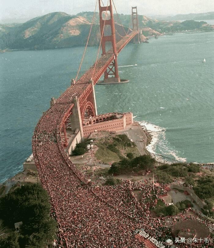 1987年估计有 80万人聚集在金门大桥上,庆祝建成50周年。人群的重量导致悬架下垂。