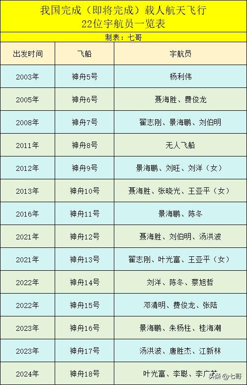 我国完成载人航天飞行的22位英雄宇航员