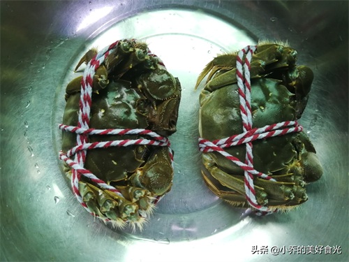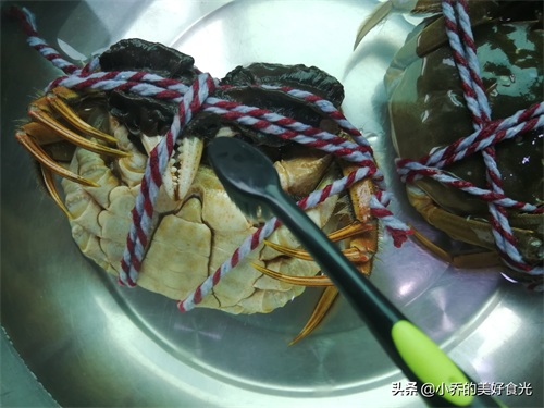 来,咱先把螃蟹绑上。捆绑的目的,一是为了清洗的时候更安全方便,更重要的是可以固定蟹腿,使蒸出来的螃蟹不会张牙舞爪,也不会蟹腿散落,蒸出来的形状整齐而完整。