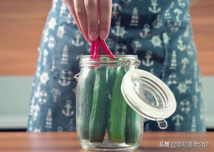 【准备原料】:小黄瓜8-12根,比小黄瓜稍微高一点的密封罐一个,红色的泡椒6根,小米辣3-6根,花椒30粒,海盐10-15克,蒜5瓣。