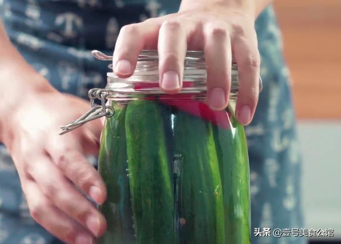 第三步:最后盖上盖子,左右颠倒摇晃30秒,然后放在冰箱冷藏腌制2-4天就可以直接食用了,具体爽脆的口感可以按照自己的喜好决定。
