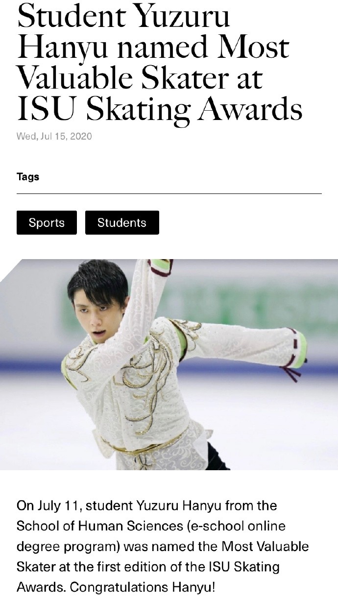 2020年7月,羽生结弦被ISU评为最有价值选手后,早稻田官方亲切的发文祝贺:“7月11日,人类信息科学系的学生羽生结弦被评为首届ISU Skating Awards的最具价值选手。羽生,恭喜你!”一句“student yuzuru”,真是倍加亲切啊!
