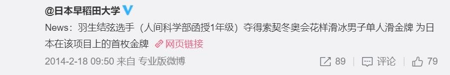早稻田大学在新浪的官方微博,在2017年停更前,几乎会对羽生结弦的每场比赛结果进行播报、祝贺。