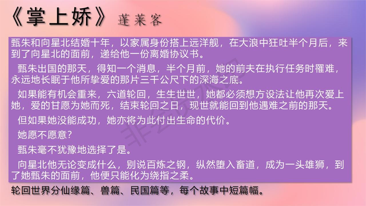 蓬莱客的小说,每篇都是精短,大多带有重生穿越题材,背景各有不同,格局框架很大,文笔细腻,情节不落俗套。小说中的的感情描写循序渐进,丝丝入扣,情绪渲染也很到位,尤其是里面的女主,多是性格坚韧和聪慧之人,远离傻白甜的这种,而男主没爱上的时候都吊的不行,爱上了以后都是大醋包,大猪蹄子!