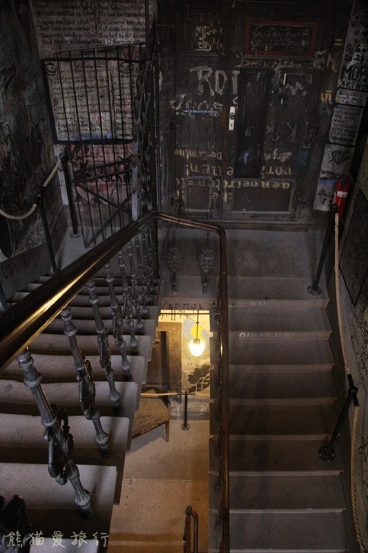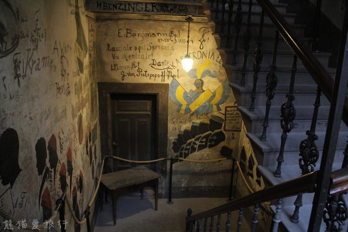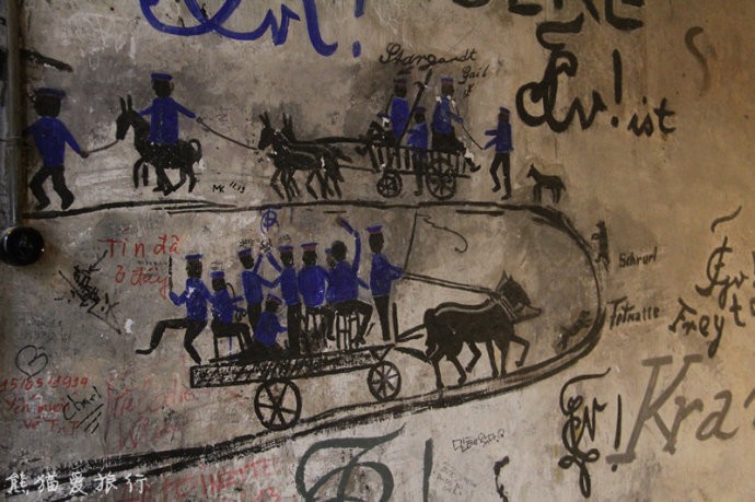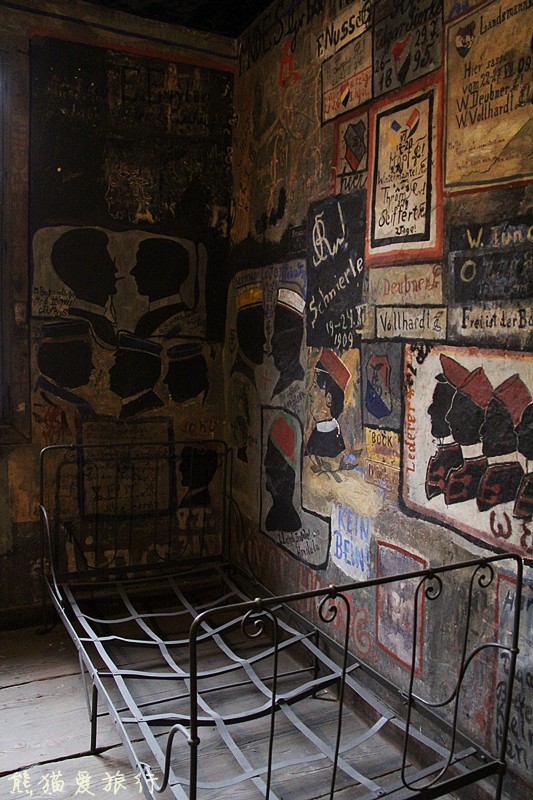 之所以会设立学生监狱,因为根据当时的法律,警察是不能关押这些学生的,但是迫于外界压力,学校自行设立了“学生监狱”,专门管理这些滋事的学生,以正校风。本以为会让学生们各自面壁思过,没想到这里变成了他们的王国。三层楼的学生监狱里面有五间牢房,虽然每间房间里简单得只有铁板床、稻草床垫、桌子和小工具,但是学生们竟然就利用这些将这里变成了一个涂鸦乐园,那些墙壁上、房顶上、楼梯上布满了当年学生们留下的笔迹和画作。上面有的是学生们的侧面头像画,有的是他们进入学生监狱的日期,以及他们跪求多关几天的期待,或者是有趣的诗文。