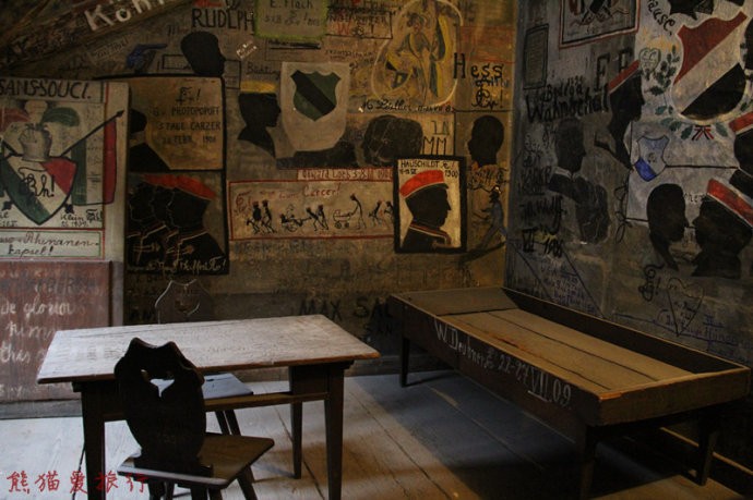 学生监狱屋顶上的画里面的黑颜色是用蜡烛油烟熏出来的,墙壁上的黑色是学生们用小铁炉子的烟灰涂的,而其他颜色是从外面带来的。现在这些画已经被涂上清漆保护起来了。有些学生还把他们的照片嵌在房间的门里面。学生们还把各个房间命名,比如“Sanscoui”,是一处早期在波兹坦的普鲁士宫殿名称,除此之外还有豪华酒店、皇家舞厅,帝王厅是他们洗漱的地方。