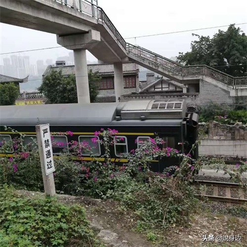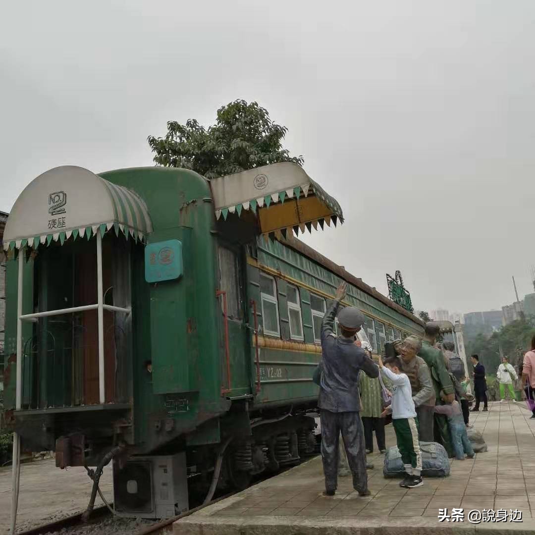 街头矗立着一节绿皮火车,旁边是极富时代特色的民众排队乘车场景,古镇紧挨着火车铁轨,偶有飞驰而过的绿皮火车,仿佛时光倒流,沿街还原有不少旧时的众生像雕塑。