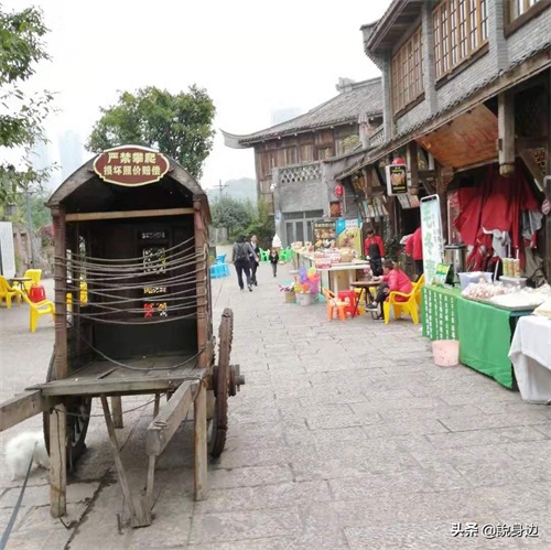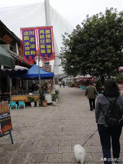 古镇小商贩沿街分布,凉粉、凉面、酸辣粉、冰粉、凉虾,中餐、火锅,手工泥塑、老相馆、免费取水点,一应俱全。