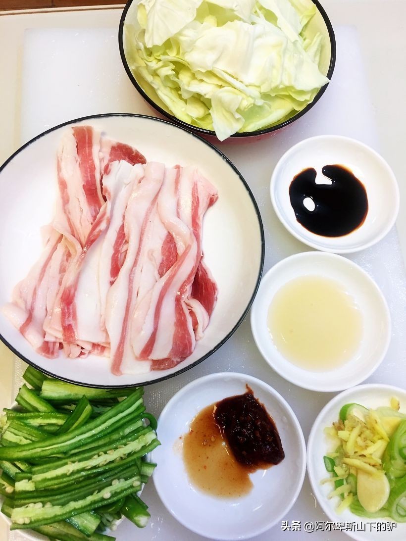 操作步骤 1.准备工作:五花肉切片,我是直接买的切好的五花肉,可能是机器切的又大又薄。包菜撕成小块,也可以用刀切。青椒切断再对半切开,清洗一下,可以去籽,这样就没那么辣。京葱切细,生姜可以切丝、切末,大蒜拍碎或者切片都可以,根据自己喜欢来。