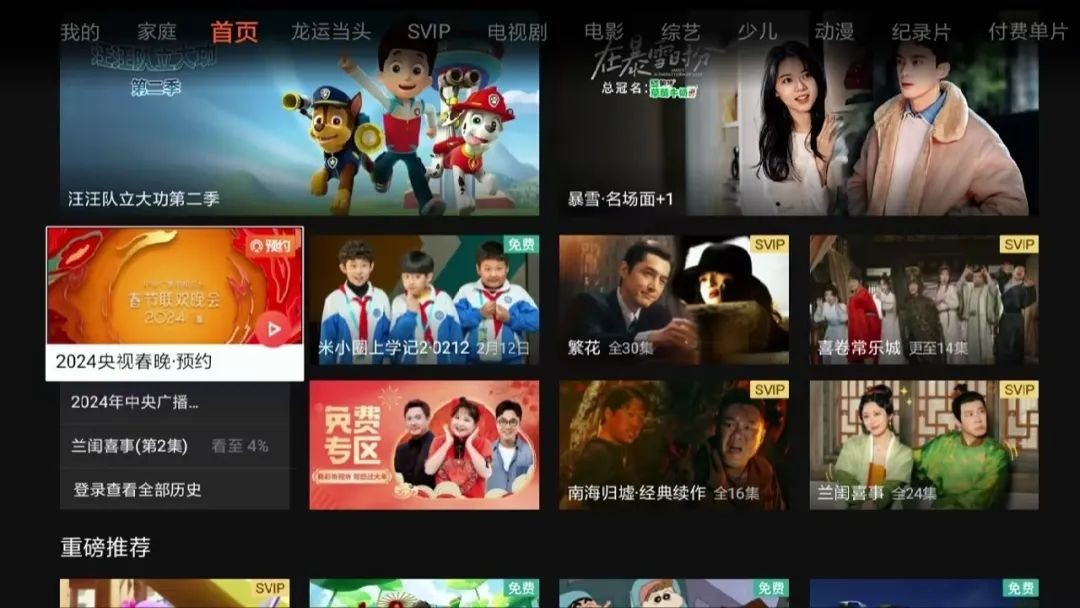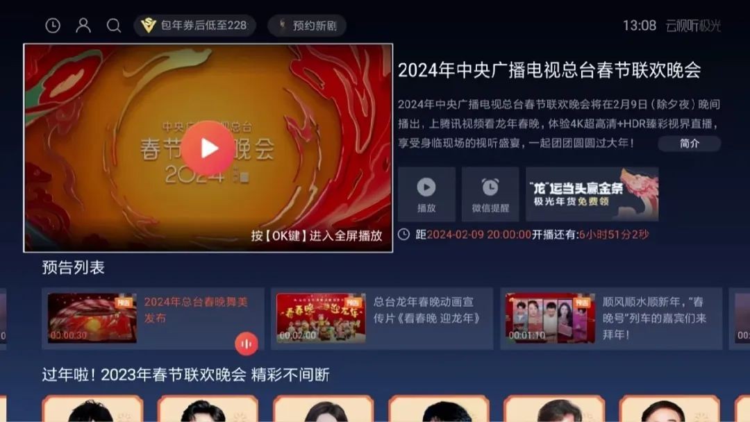 电视上安装视频客户端(比如腾讯视频的tv端叫做云视听极光),可以提前预约春晚直播。