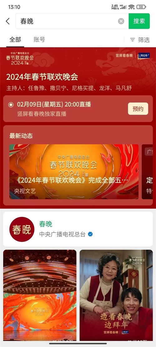 微信视频号中搜索春晚关键词,可以竖屏观看春晚。