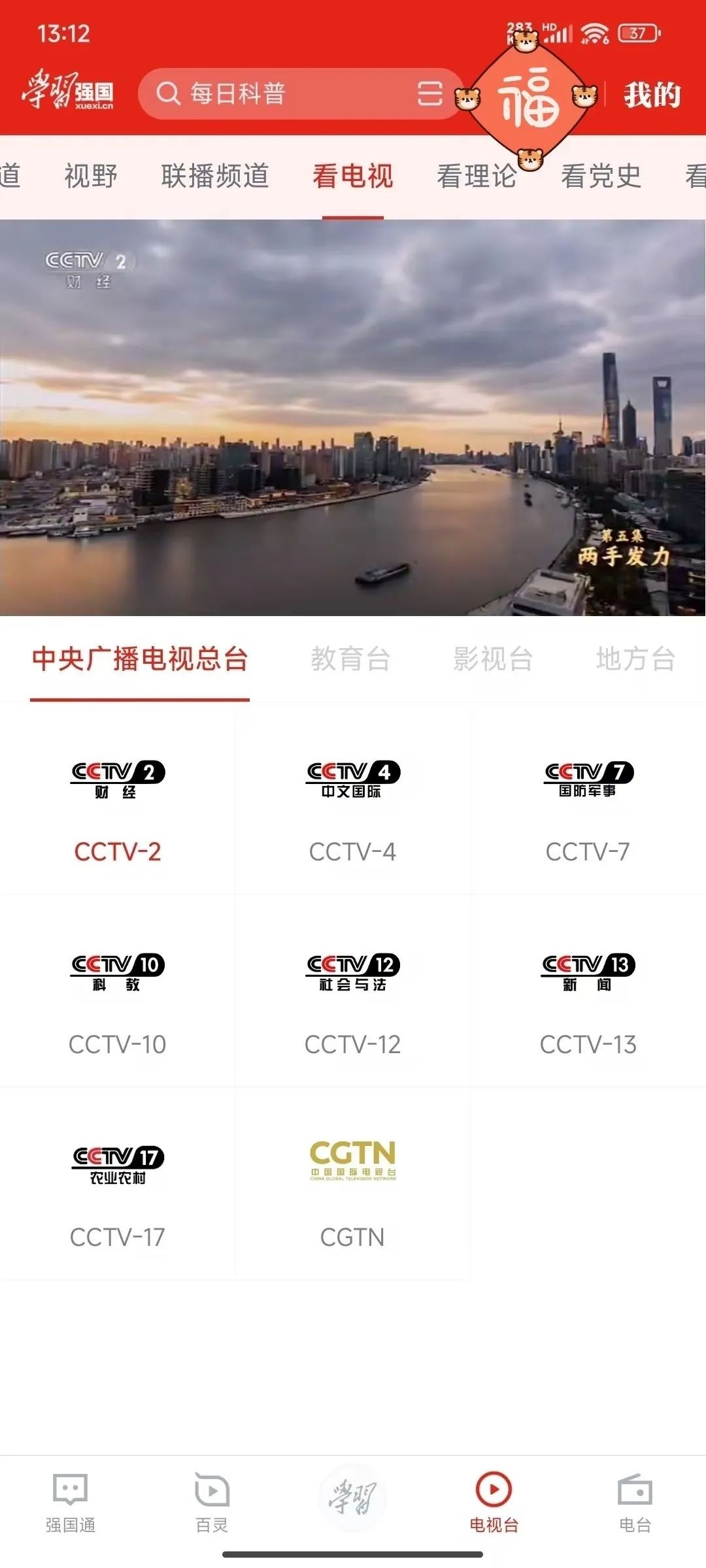 如果安装了学习强国app,也可以直接观看各个电视台的直播内容。