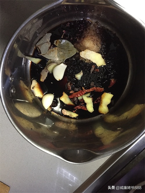 另外准备一锅放入准备好的调料,茶叶,香叶,花椒,大料,盐,老抽,酱油,料酒和糖,盐要多放一些,加水大火烧开。(水刚没过鸡蛋就行)