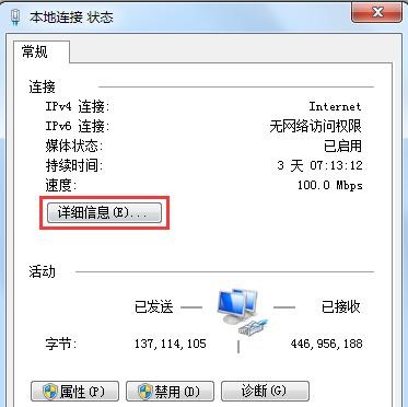 在详细信息的列表中确认已开启DHCP为是;可以看到自动获取到的Pv4地址、默认网关、DNS服务器地址等信息。