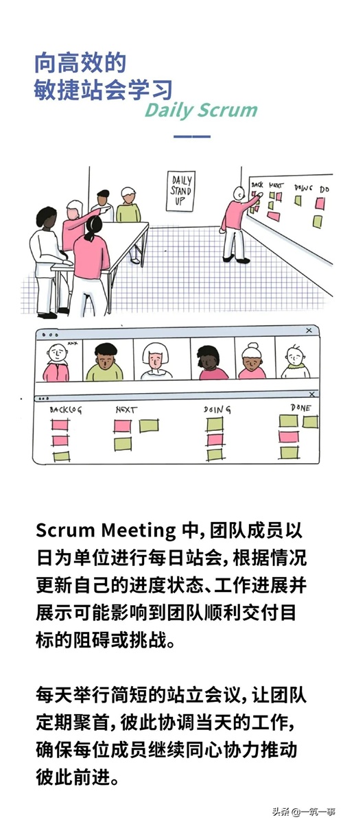 4)每日站会 (Daily Scrum Meeting) 团队根据计划细化任务分配,进行具体的工作。团 队成员以日为单位进行每 日站会,根据情况更新自己的进度状态、工作进展 并展示可能影响到团队顺 利交付目标的阻碍或挑战。每天举行简短的站立会议,让团队定期聚首,彼此协调当天的工作,确保每位成员继续同心协力推动彼此前进。