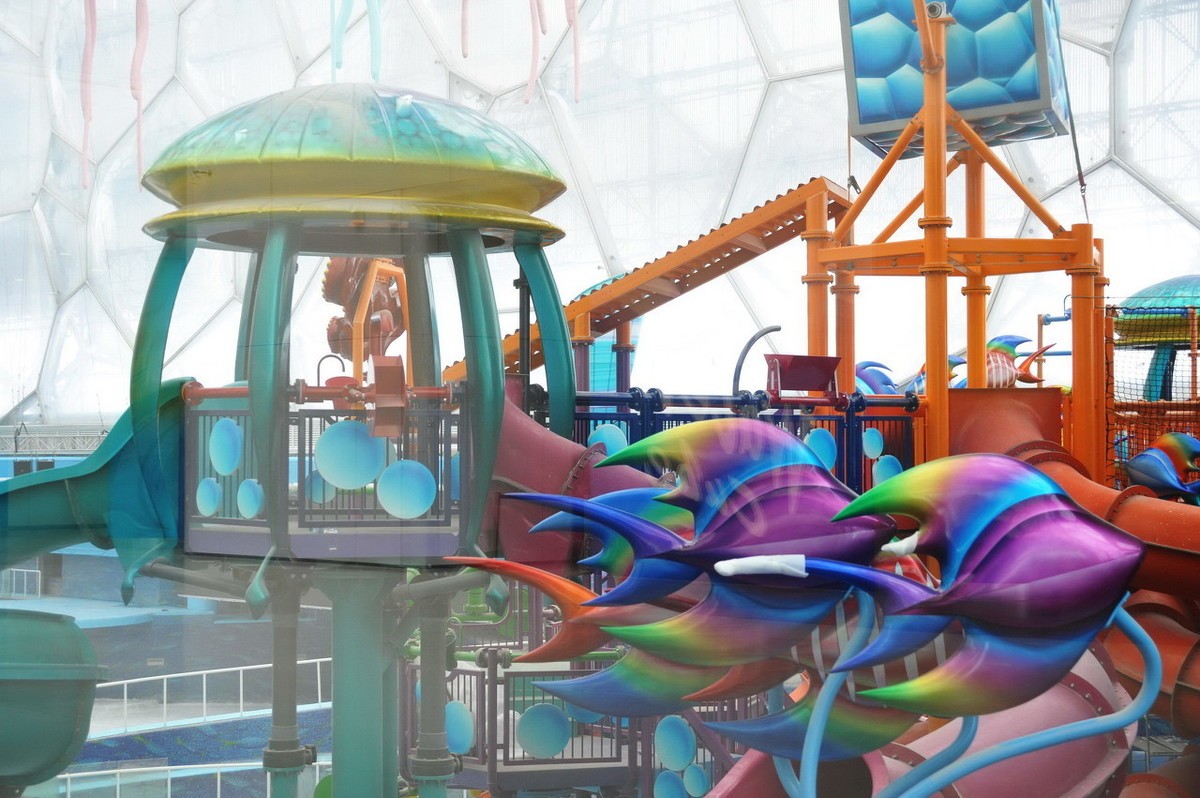 玩水是孩子的天性,在水立方蓝色透明的泡泡膜下四处浮动着五彩鲜艳的珊瑚、透明柔美的水母、青青翠绿的海草、造型奇特的鱼群,搭配梦幻般的灯光与音乐,营造出梦幻般的海底童话世界,使整个乐园充满着欢动跳跃的“水元素”。