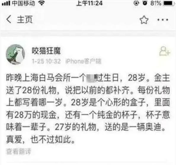 平常人的毕生积蓄可能只是富婆为博“佳人”一笑随手赠送的生日礼物。