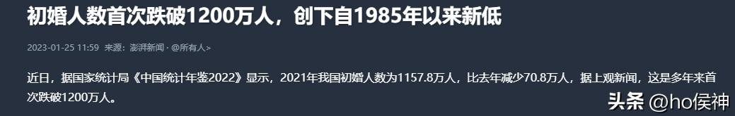 信息来源:澎湃新闻-《初婚人数首次跌破1200万人,创下自1985年以来新低》