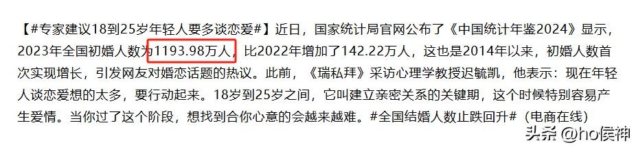 但是影响结婚的住房、成本还有三观等问题还是需要从长计议,要是考虑上这些因素,那24年初婚的人数,估计还是会出现下降……