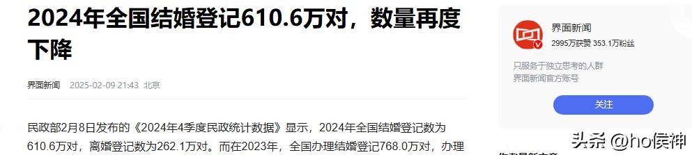 信息来源:界面新闻-《2024年全国结婚登记610.6万对,数量再度下降》