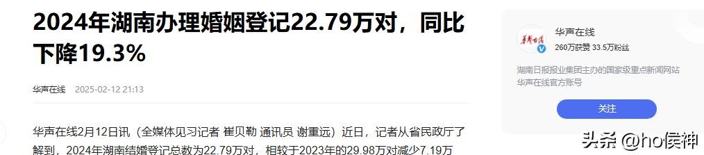 信息来源:华声在线-《2024年湖南办理婚姻登记22.79万对,同比下降19.3%》