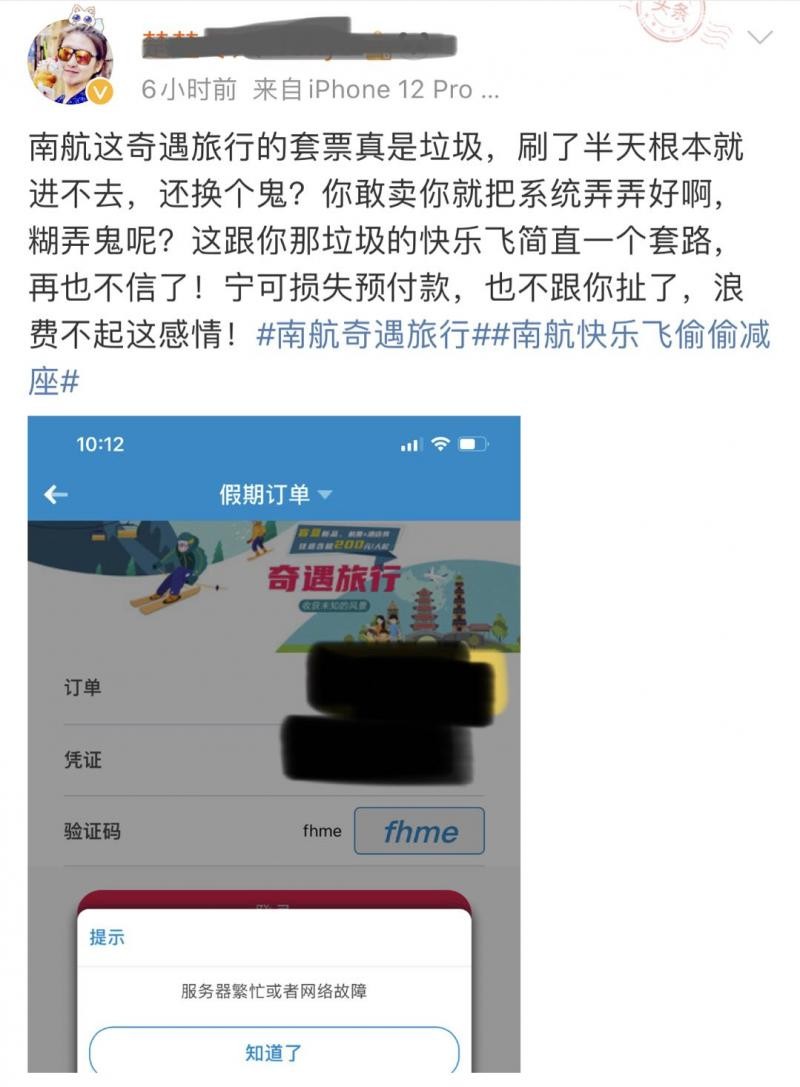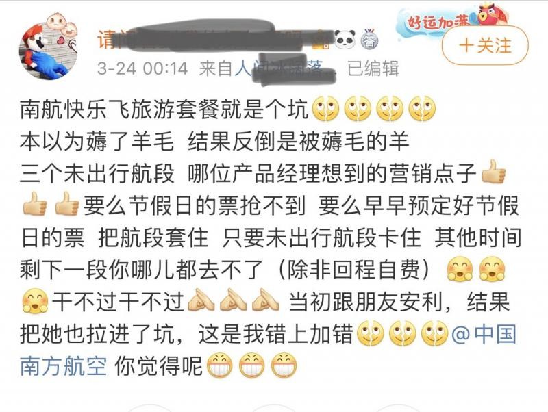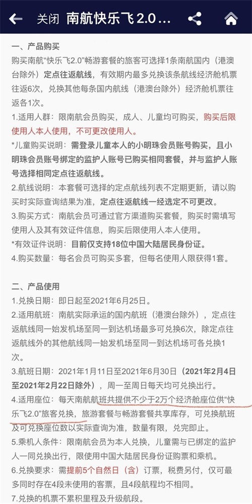 在南方航空APP上,快乐飞2.0的活动宣传——给自己多放几个假,现在就出发。但在实际购买了该产品的消费者看来,快乐飞2.0不仅不快乐,简直有点“堵心”。