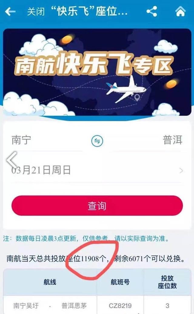 然而,王先生有时间周末时间出游时,却在南航APP兑换快乐飞机票时,遭遇了换票难的问题。他连续查询了广州出发前往大理、丽江、三亚、昆明等多个城市的航班,都被告知已经没有余位。他后来发现,3月11日只有1.19万个座位,“每日提供不少于2万个”座位的供应量”居然被砍半,难怪一直显示无票。