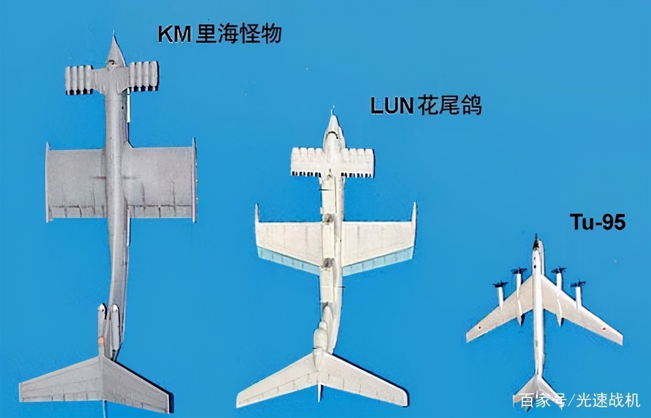 苏联于1923年已开始研究翼地效应飞机,也就是现在所说的“里海怪物”地效飞行器,主要在军事上使用,其背部有三组导弹发射筒、反潜和突击登陆。主要是利用机翼和机身在“地效区”,如地面、水面产生一定升力。同时在机翼与地面或水面之间,产生一种看不见的气垫增升效应,兼具舰船和飞机的优点。“里海怪物”的一个显著特点是大,和图95战略轰炸机对比,就像老母鸡带小鸡一样。从尺寸大小看,“里海怪物”长106.1米,翼展40米,,而图95长只有49.5米,虽然翼展超过了“里海怪物”,但图95最大起飞重量只有188吨,而里海怪物起飞重量达到495吨。所以说这个里海怪物是“真”的大。