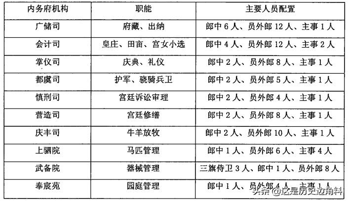 七司三院分工分工各不相同,其中主要人员如郎中、员外郎、主事、三旗侍卫等职,均由内务府包衣担任,正如下表所示: