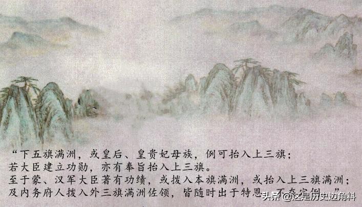 抬旗是内务府包衣提高地位的重要方式,所谓抬旗,简单说就是将下五旗的旗籍抬入上三旗,除此之外,清朝八旗还分满八旗、蒙古八旗和汉八旗,其中满八旗地位最高,蒙古八旗次之,汉八旗最后。抬旗也可以从地位较低的八旗旗籍抬入满八旗。