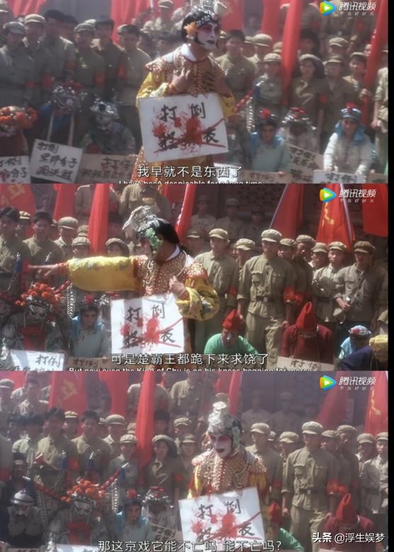 被段小楼当众揭发是汉奸,和袁四爷有私情,程蝶衣的控词最动情之处却是:我早就不是东西了,可是连楚霸王都跪下来求饶了,那这京戏它能不亡,能不亡吗?
