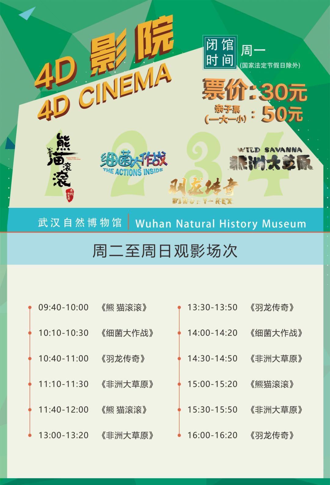 长江文明馆(武汉自然博物馆)内设有4D影院售票处,位于武汉自然博物馆一层西侧室内。4D影院最多可容纳80人同时观影。目前我馆放映的4D电影共有4部,分别是:《熊猫滚滚》、《羽龙传奇》、《细菌大作战》、《非洲大草原》。