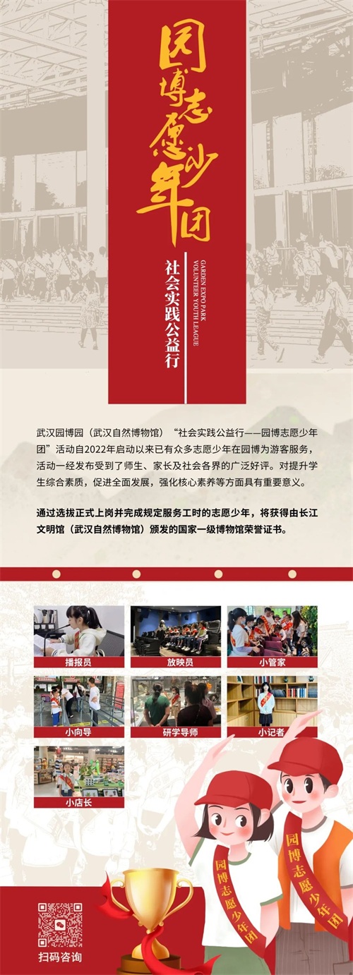 假期期间,我们将能在园博园东门内广场、外广场,长江文明馆自然厅、人文厅,长江文明馆文创商店,武汉自然博物馆4D电影院等各处见到少年团服务的身影,共同见证小小少年们在社会实践的岗位上发光发亮,让孩子们度过一个意义非凡的十月。