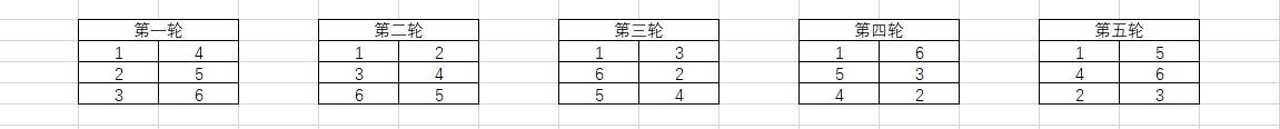 较为常见的编排赛制的方法为顺时针旋转法:保持1不变,其余各队按顺时针旋转。