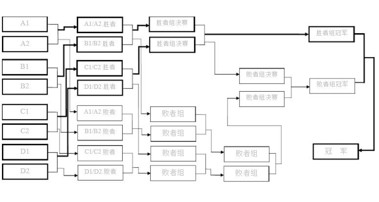双败淘汰制,即一支队伍失败两场被淘汰出局,直到最后剩下一支队伍夺得冠军。即战队抽签后两两交战,胜者继续留在胜者组,败者则掉入败者组。在败者组一旦失败即被淘汰,最后由胜者组和败者组的冠军决出总冠军。