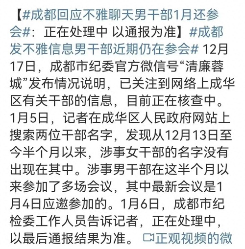 1月7日,成都市成华区一男一女不雅聊天丑闻有了进展。 “廉洁成都”正式称号揭晓。关于成华区相关干部违纪违法行为的核查处理: