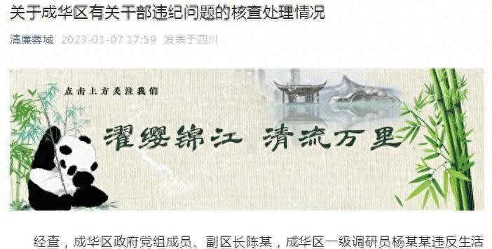 经调查,成华区政府党组成员区长·陈某副主任、成华区一级学者杨某某违反生活纪律,目前正在按程序追究责任并建议免职。”