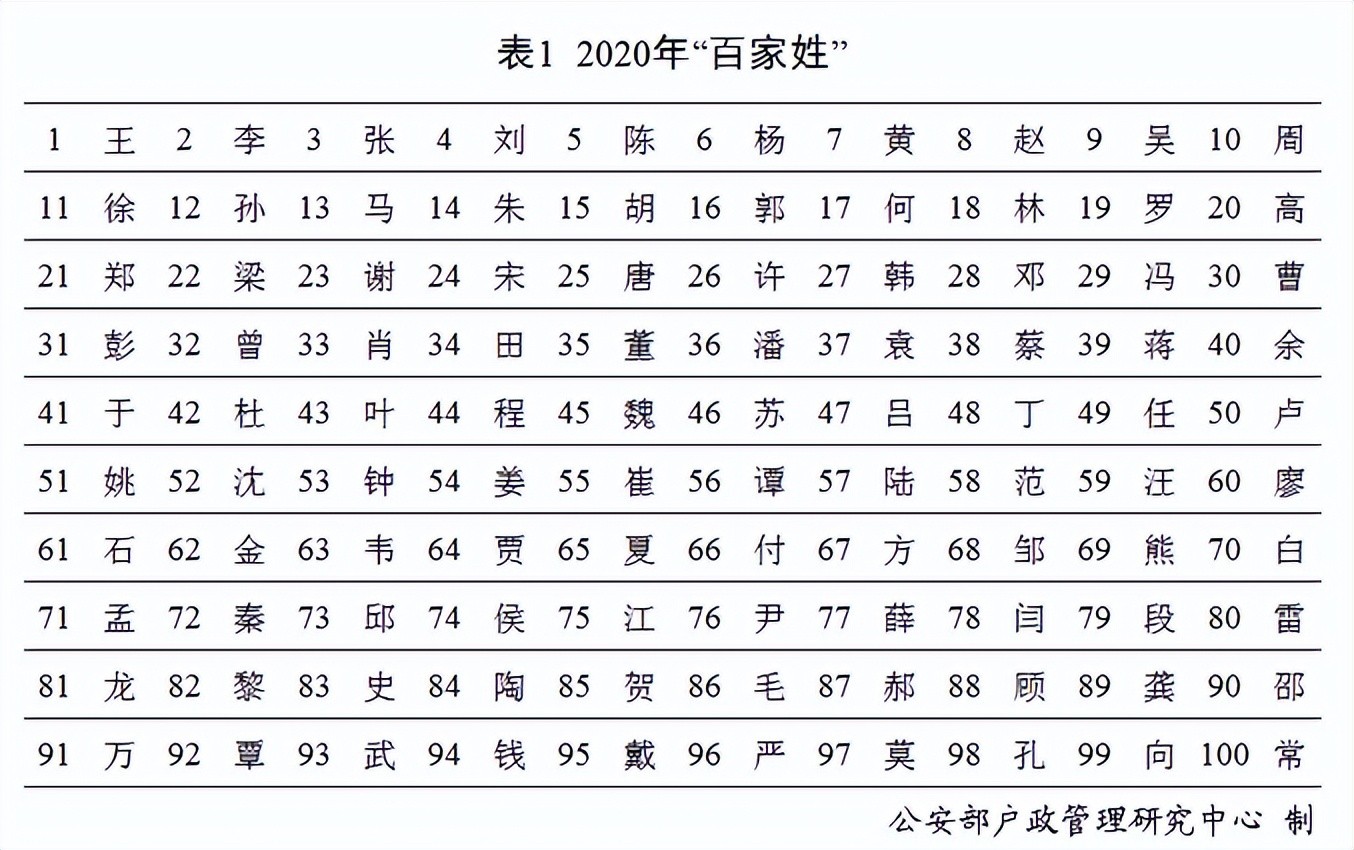根据公安部《二〇二〇年全国姓名报告》,按户籍人口数量排名,2020年名列前五的姓氏为:“王”、“李”、“张”、“刘”、“陈”。五大姓氏人口总数占全国户籍总人口的30.8%。下表为根据户籍人口数量排名的2020年“百家姓”,大家看看你的姓氏排名第几?