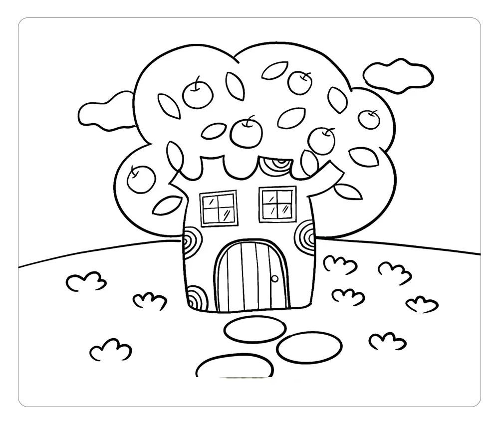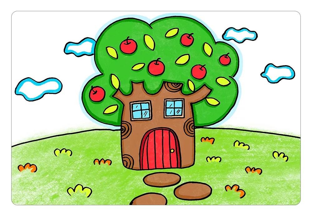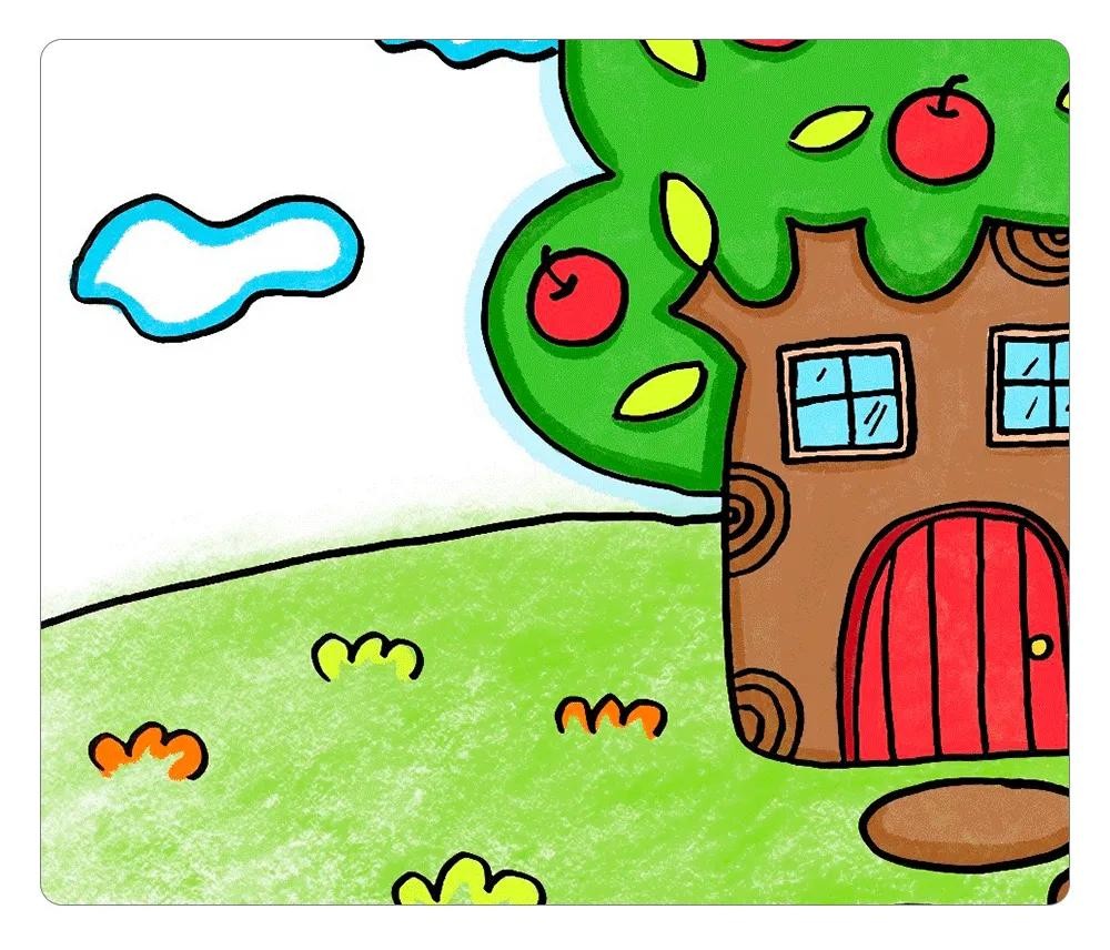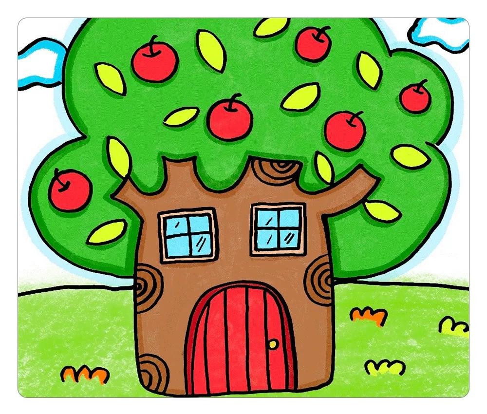 小朋友们,大家好~今天要画一幅美丽的风景简笔画:可爱的苹果树屋,先思考一下,你想象中树屋应该是什么样子呢?它会长出哪些果实呢?它会是什么颜色呢?发挥你的想象力吧。