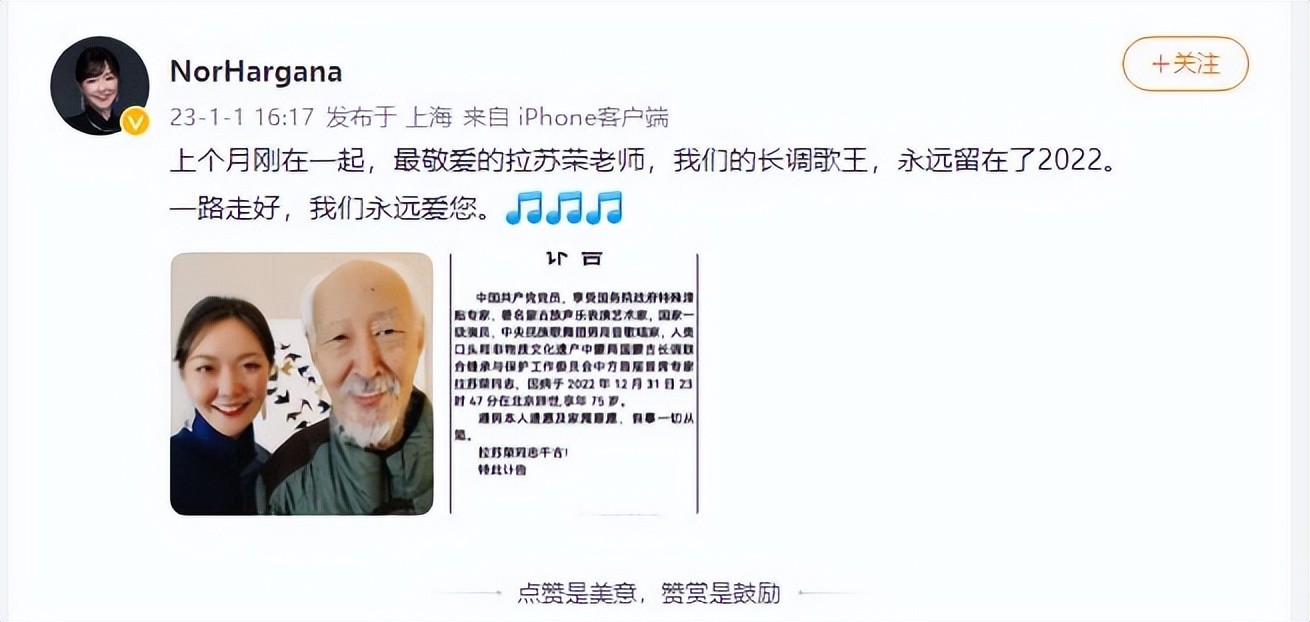 她在配文中写道:上个月刚在一起,最敬爱的拉苏荣老师,我们的长调歌王,永远留在了2022,一路走好,我们永远爱您。