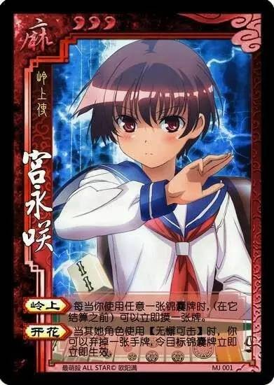 宫永咲是漫画《天才麻将少女》及其衍生的动画等作品中的主人公,在打麻将时拥有超乎常人的直觉和运气,经常将对手虐到哭。擅长的役种为岭上开花并且在胜出后自带名言“打麻将真开心啊!” 经常在前期放水,给对手以胜利的希望,到最后关头上演逆转,让对手陷入彻底的绝望之中,这种天然腹黑系的特点让她在二次元麻将桌上占据绝对的支配地位而被称为“岭上开花大魔王”~