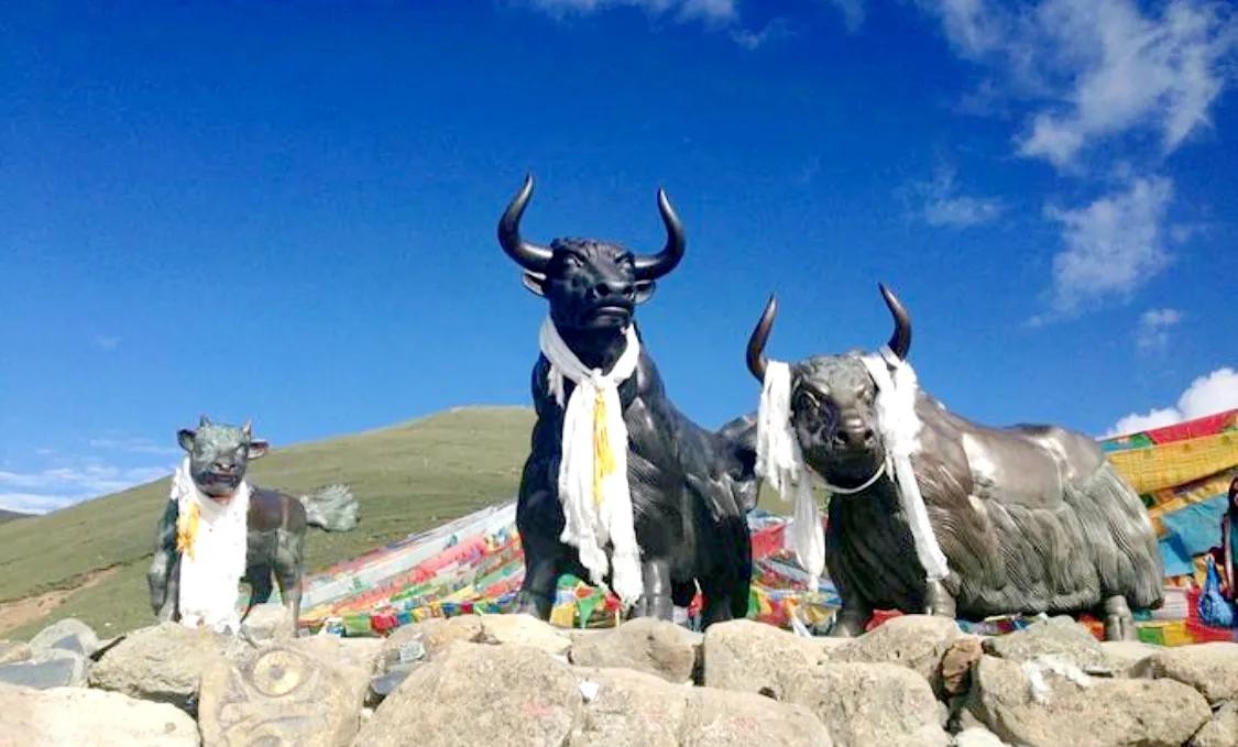 米拉山垭口之上,矗立着米拉山的大山之魂“雪域之舟”,这是一组的牦牛石雕像。它们,镇守在这高高的山口之上,黢黑强健的身躯,彰显着人们对自然对美的永恒追求。它们,奋力向前,将藏民的虔诚心愿传达给上苍神灵;它们,俯视苍生,日夜不歇地向人们诉说着自己的坚贞与不屈。