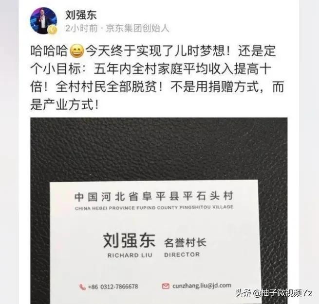 近日,刘强东在微博晒出自己的新名片,身份是河北省阜平县石头村的名誉村长。尽管只是个名义村长,但赴任之际还是让刘强东激动不已,表示从来没有这么激动兴奋过,并表示将通过产业方式让全村实现脱贫致富。