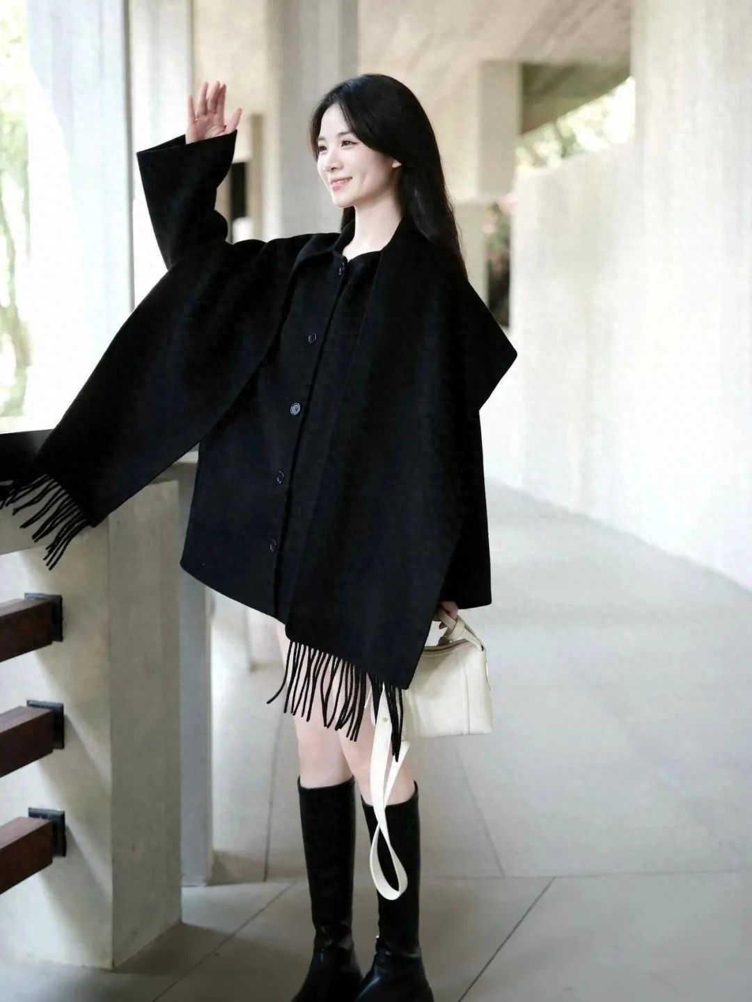 而大衣上的流苏设计,更是点睛之笔,仿佛为整体造型注入了灵动的旋律。每一步行走,都是一场时尚的盛宴,让人目不暇接。✨