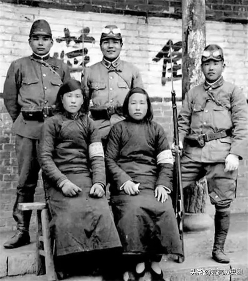 这张照片还是让人比较痛恨的,两个中国女人坐在最前面的凳子上,后面站着日寇,看似她们挺受重视,其实日寇只不过为了宣传而演戏罢了,并且这两个女人还是通敌的汉奸,不错,日本侵华时期中国的汉奸是很多很多的,男女老少都有,从侧面看出当时中国人中的软骨头还是很多的。