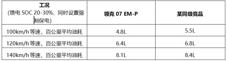在高速馈电续航和能耗测试中,领克07 EM-P的表现同样令人瞩目。当车辆以100km/h、120km/h和140km/h的车速行驶时,其百公里能耗相较于竞品车型具有明显优势。高速馈电油耗表现优秀,使得领克07 EM-P的续航能力更加强劲。这主要归功于其多挡位设计,使得发动机在高速巡航时能够工作在最佳经济区间。