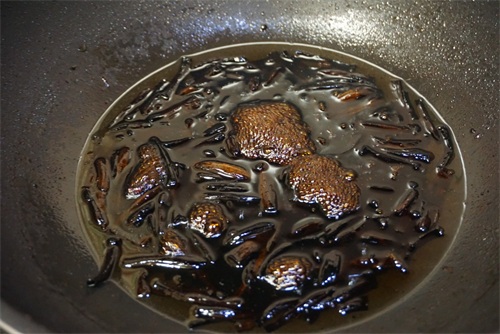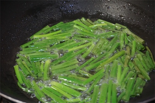 2.香葱只用葱绿部分,葱白部分也别浪费,可以和鸡蛋一起炒着吃。葱绿切4-5cm长。锅中放油,开小火加入桂皮和八角,炸出香味后捡出去不用,然后放入香葱段。