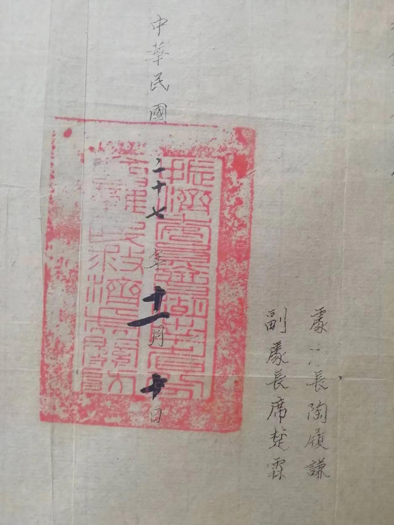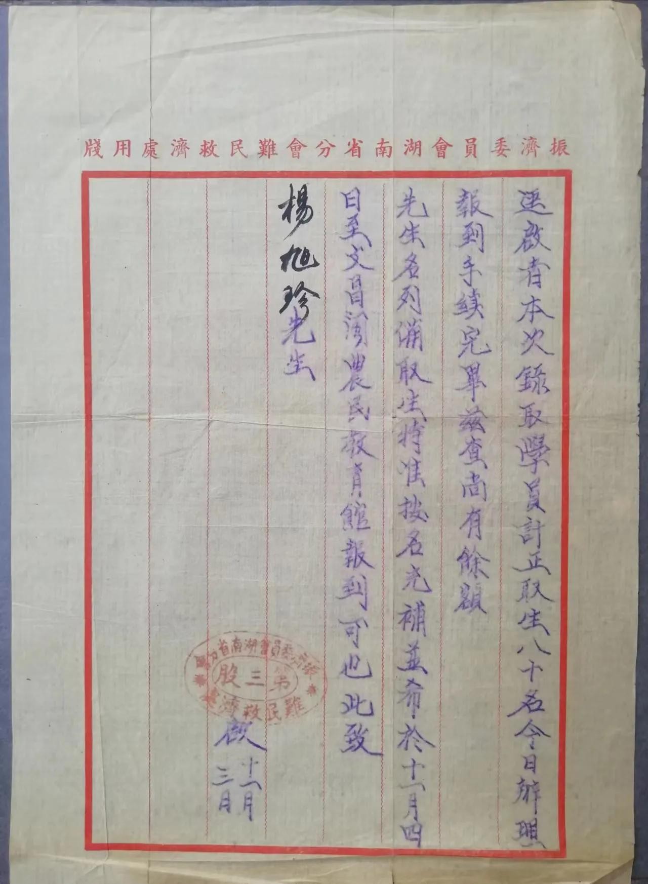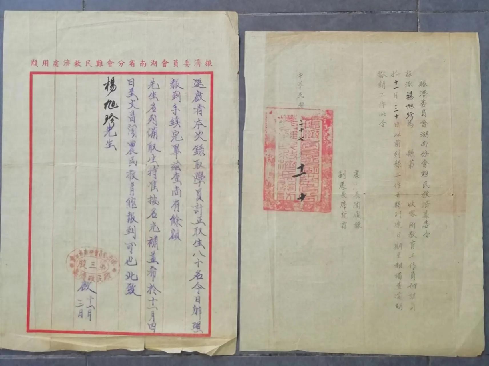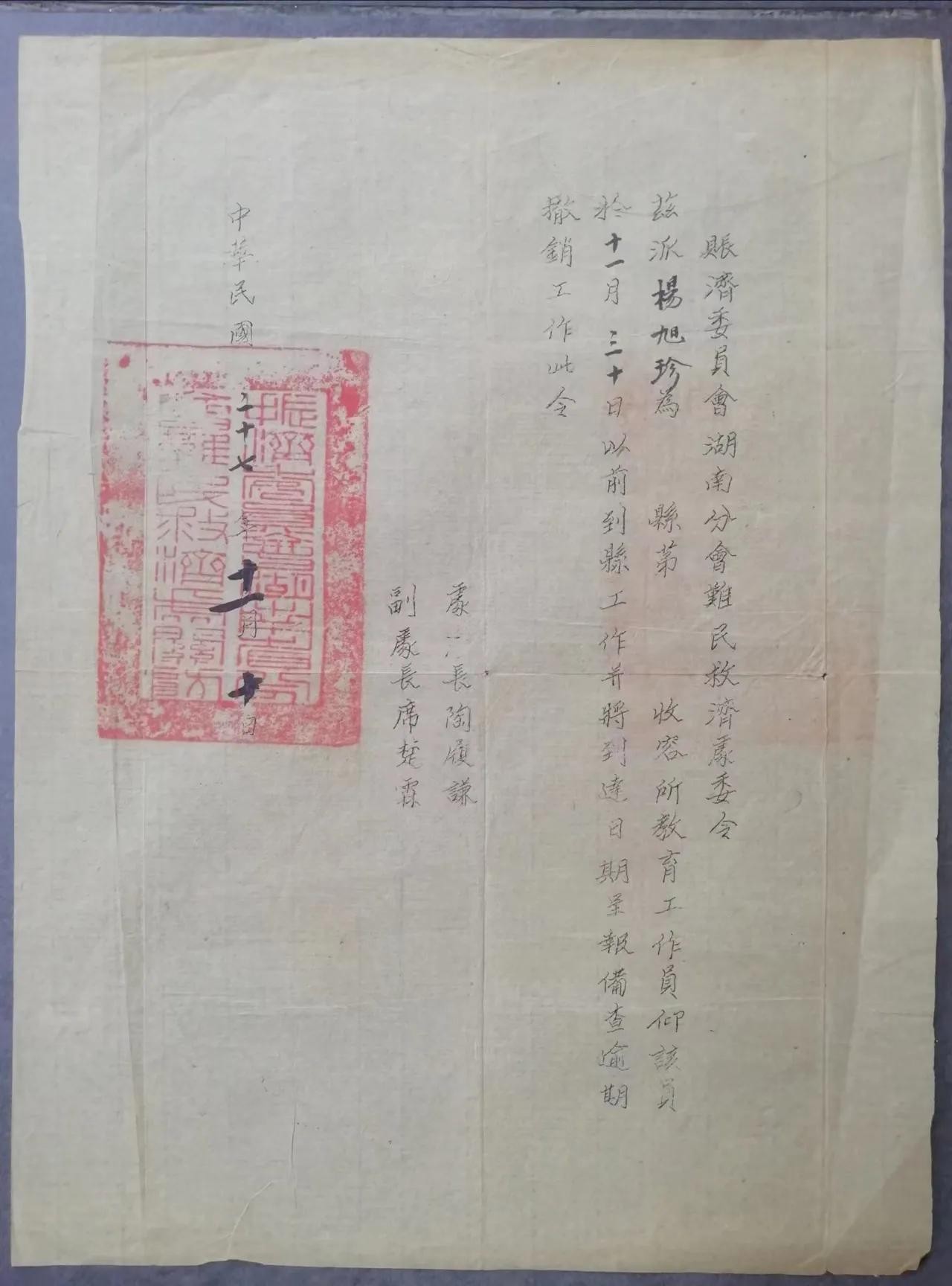 一件旧档案中的名款,引出一段湮没良久的惨疼往事:1938年11月13日凌晨2点,长沙城突然间被大火吞噬。这场大火燃烧了5天5夜,大火过后长沙城90%的建筑毁于一旦,更有30000多名长沙百姓在大火中丧生。造成一桩震惊中外的惨案,成为长沙人民心里永远的伤疼。这场大火,是20世纪中国最重大的历史事件之一。由于12日电报韵目代码为“文”,故又称“文夕大火”。这件民国二十七年十一月十日由赈济委员会湖南省分分难民救济处委令,就是“文夕”大火发生前三天所签发,救济处正副处长由时任省政府民政厅长陶履谦,长沙市长席楚霖兼任。这两位省府和地方大员,正是“文夕”大火政策的制定者,参与者,也亲身经历了这一事件,因此在余生悔恨不已。长沙大火,惨重的损失是无法掩饰的,单是死伤人数就无法统计,其他财产损失不可数计。人民遭此浩劫,无不义愤填膺,纷纷要求惩办纵火罪犯,发放救灾物资。在人民的压力下,国民党政府如何向公众交代呢?蒋介石不得不采取一些措施以平民愤。于是,组织军法会审,判处长沙警备司令酆悌、警备第二团团长徐昆、长沙市警察局局长文重孚3人死刑,于11月18日执行枪决。省主席张治中,长沙市长席楚霖,革职留任处分。时至今日,湖南省湘阴县开福冲村、新宁县庄姜村和桃江县黄土仑村,有三座衰草丛生的坟墓,黄土堆下正是这三个当年叱咤风云的党国要人:长沙警备司令酆悌、长沙警备二团团长徐昆和湖南省会警察局长文重孚。80余年过去,封土依旧,但喧嚣早已不再。这件公文,历经大火而毫发无损地保存下来,可谓奇迹,另一件救济处的通知公函,因为内中有“文昌阁农民教育馆”,同样也是一件珍贵的长沙乡土历史资料。