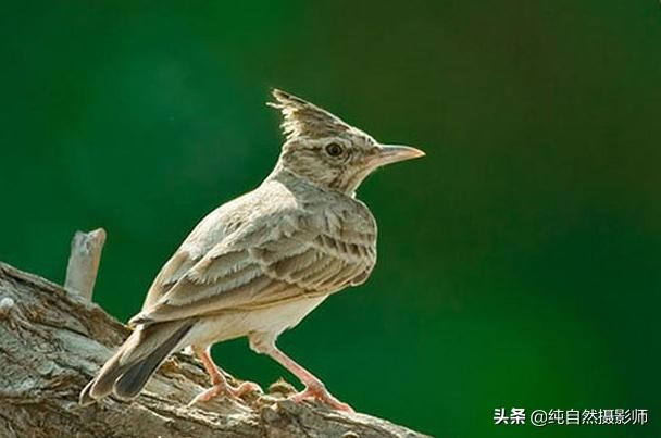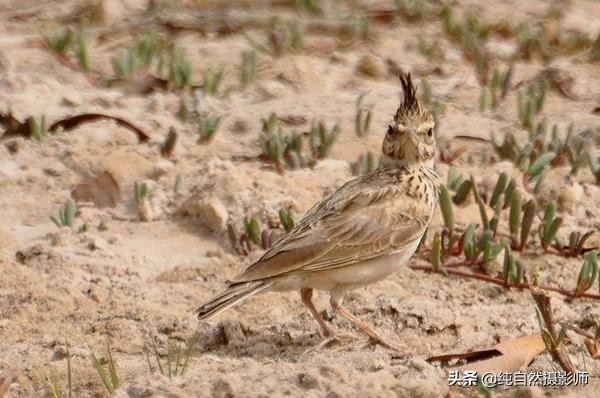 凤头百灵(学名:Galerida cristata)凤头百灵是一种小型鸣禽。身长17-18厘米,翼展29-34厘米,体重35-45 克。体型略大的具褐色纵纹的百灵。具羽冠,冠羽长而窄。上体沙褐而具近黑色纵纹,尾覆羽皮黄色。下体浅皮黄,胸密布近黑色纵纹。看似矮墩而尾短,嘴略长而下弯。飞行时两翼宽,翼下锈色;尾深褐而两侧黄褐。幼鸟上体密布点斑。与云雀区别在侧影显大而羽冠尖,嘴较长且弯,耳羽较少棕色且无白色的后翼缘。中央一对尾羽浅褐色,最外向侧一对尾羽大部分为皮黄色或棕色,仅内翈羽缘黑褐色。外侧第二对尾羽仅外翈有一宽的棕色羽缘。翅上覆羽浅褐色或沙褐色,飞羽黑褐色,外翈羽缘棕色,内翈基部亦有宽的棕色羽缘。体型羽色略似麻雀,适应于地栖生活,腿、脚强健有力,后趾具1长而直的爪;跗跖后缘具盾状鳞;喙短而近锥形,适于啄食种子;翅尖而长,内侧飞羽(三级飞羽)较长;尾羽中等长度,具浅叉,外侧尾羽常具白色。