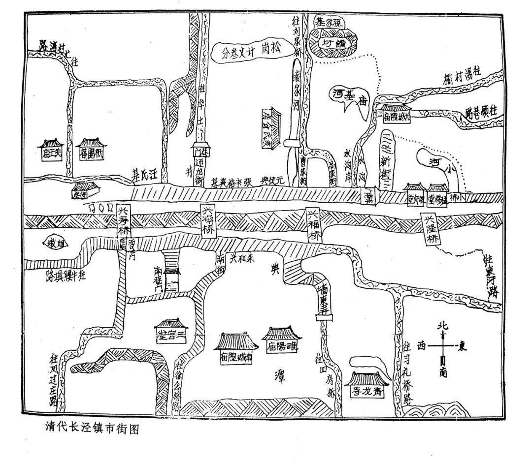 南宋绍定《江阴志》载:东舜乡,县东七十里,管里一:东城。这个东城,在今长泾镇境内,但这个东城与西舜乡的庆云一样,已考证不出具体在今天镇中的什么地方了。据雍正年间长泾士人覆花楼主人程国昶撰写的《泾里志》记载,在宋代,长泾这块地方已有南北两市(南市大约在今陈店桥、四房桥,后因生意兴隆,改名为盛店桥,北市大约在今汤村桥),两市中间的地区叫长泾里,简称泾里。长泾里东有东泾河,西有西泾河,两河相距有几公里,中间横着一条浅溪叫泾水,长泾里又名三泾里。